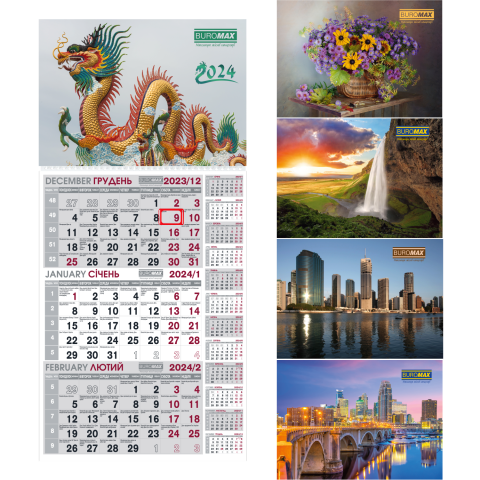 Календар BUROMAX на 2024 рік – незамінна річ, яка допоможе Вам легко спланувати свій місяць, квартал і рік. Зручний настінний квартальний календар на одній білій пружині 12 відривних аркушів з крейдованого паперу щільністю 90 г/м² розміром 298х420 мм На кожному аркуші три місяці детально: поточний, попередній та наступний та невеликий календар на рік Розмір виробу: 297х630 мм Розмір постера: 297х210 мм, виготовлений з целюлозного картону 300 г/м² Календарна сітка на двох мовах: українською, англійською Комплектується вказівником дати і отвором для кріплення Додаткова інформація: церковні, державні та професійні свята, вихідні дні 20 шт. в упаковці (5 дизайнів асорті кожного 4 шт. каждого))