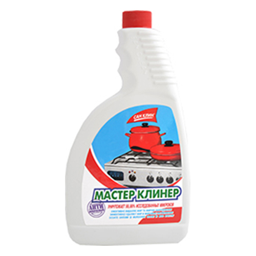 Чистящее средство для плит Сан Клин, Мастер Клинер с легкостью справится с грязью на кухни. Предназначено для удаления жира, нагара, сажи и копоти. Подходит для чистки бытовых изделий из керамики, фарфора, а также эмалированных и фаянсовых изделий. Упаковка: без распылителя. Объем : 750 мл. При обработке используйте перчатки.