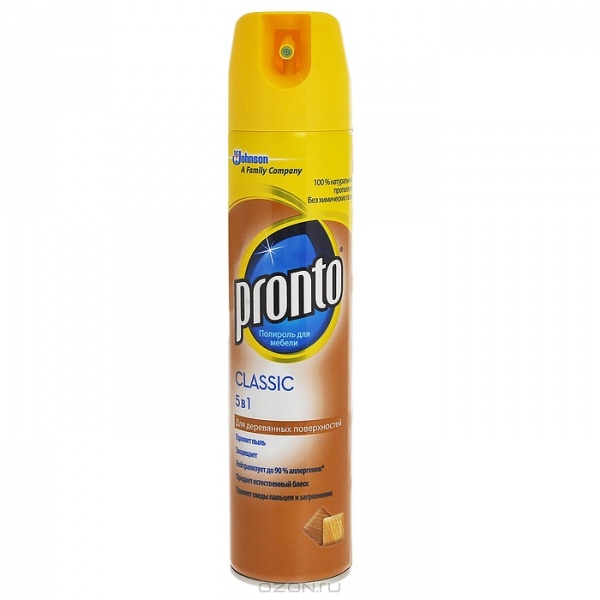Это средство подходит для любого типа мебели. Аэрозоль содержит специальные вещества, которые поддерживают необходимый уровень влаги в древесине, дабы надолго сохранить ее первоначальные характеристики. А входящий в состав PRONTO КЛАССИК пчелиный воск не только создает защитную пленку на поверхности, которая предотвращает негативное воздействие окружающей среды, но и помогает скрыть мелкие дефекты. Полироль отлично справляется с отпечатками, пылью, грязью, оставляя после себя чистоту, естественный блеск и легкий аромат. Доверьте красоту своей мебели профессионалу с мировым именем.