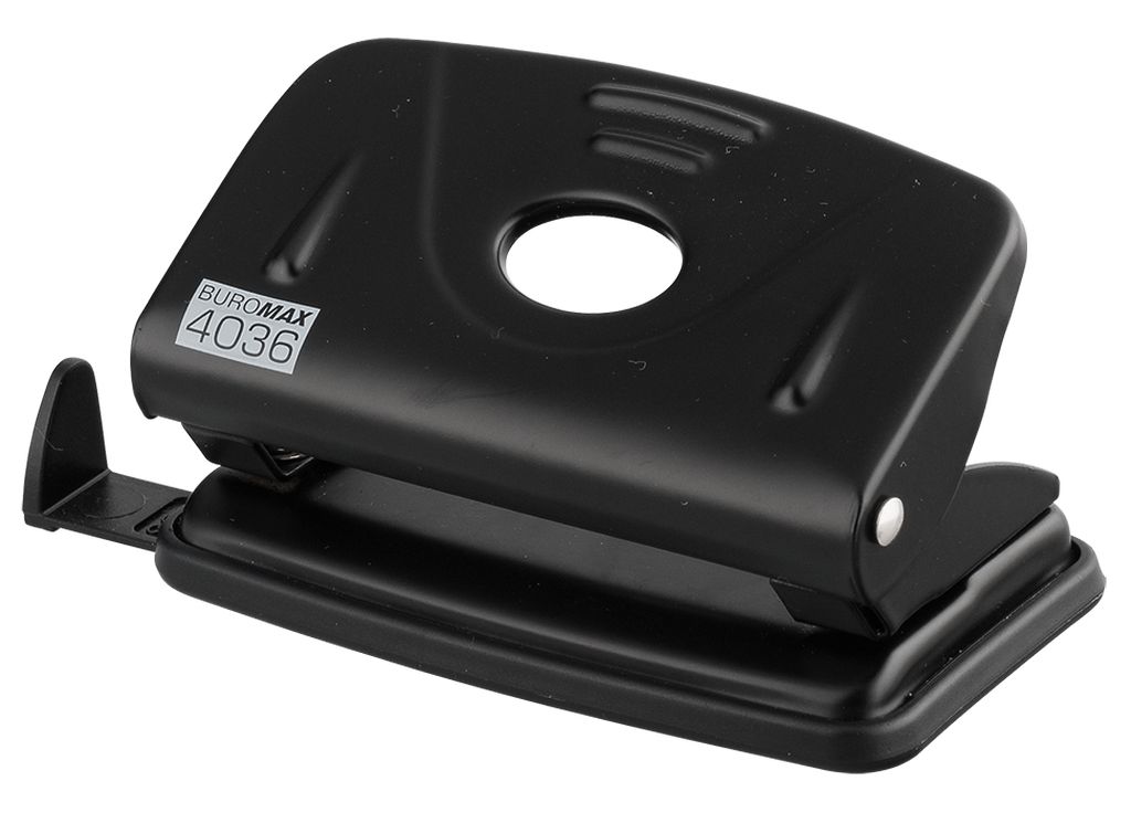Дырокол металлический BUROMAX с пробивной мощностью 10 листов бумаги 80г/м2. Размер:100х61х52мм, цвет: черный, съемный пластиковый контейнер, линейка с форматной шкалой.