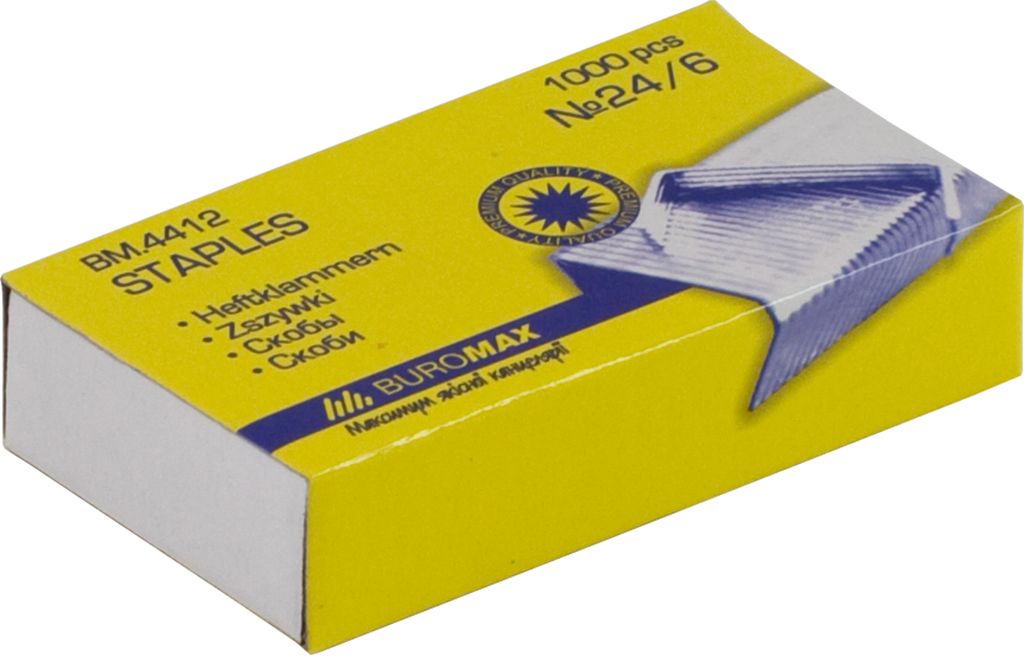 Скобы №24/6 к степлеру, скрепляют до 30 документов. Материал скоб - цинк. Упакованы в картонную коробочку - 1000 штук.