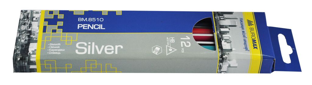 Корпус карандаша деревянный с серебристым матовым покрытием и цветными ребрами.