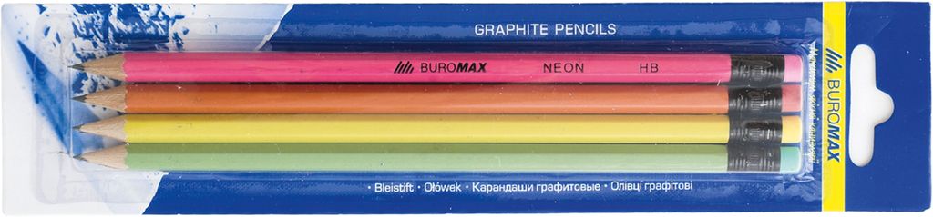 Набор из 4-х графитных карандашей шестигранной формы, с ластиком под цвет корпуса, предназначены для черчения, рисования и письма.