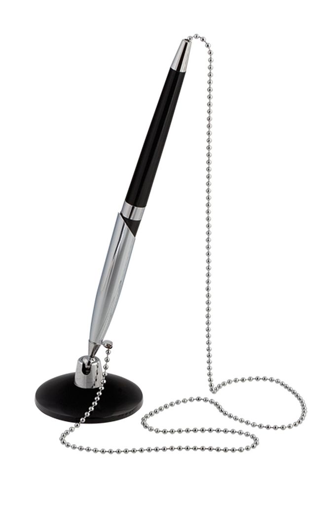 Ручка шариковая на подставке с цепочкой, металлические хромированные детали, сменный стержень 107мм. Самоклеящееся основание подставки.