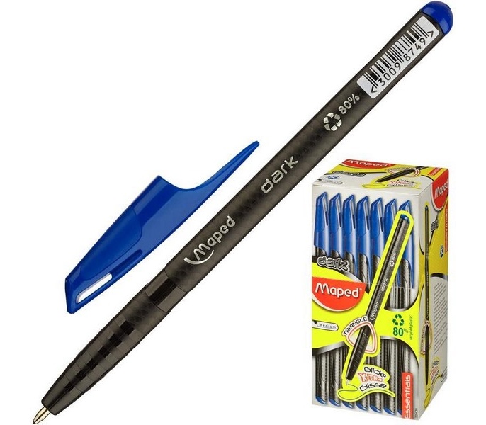 Эргономичная шариковая ручка Maped Dark в треугольном корпусе черного цвета с имитацией карбонового покрытия. Одноразовая, с маловязкими чернилами синего цвета, Maped Dark рассчитана на 1500 метров мягкого и комфортного письма и не оставляет помарок на бумаге. В упаковке 50 ручек. Толщина пишущего узла 1мм, толщина линии 0,6мм.