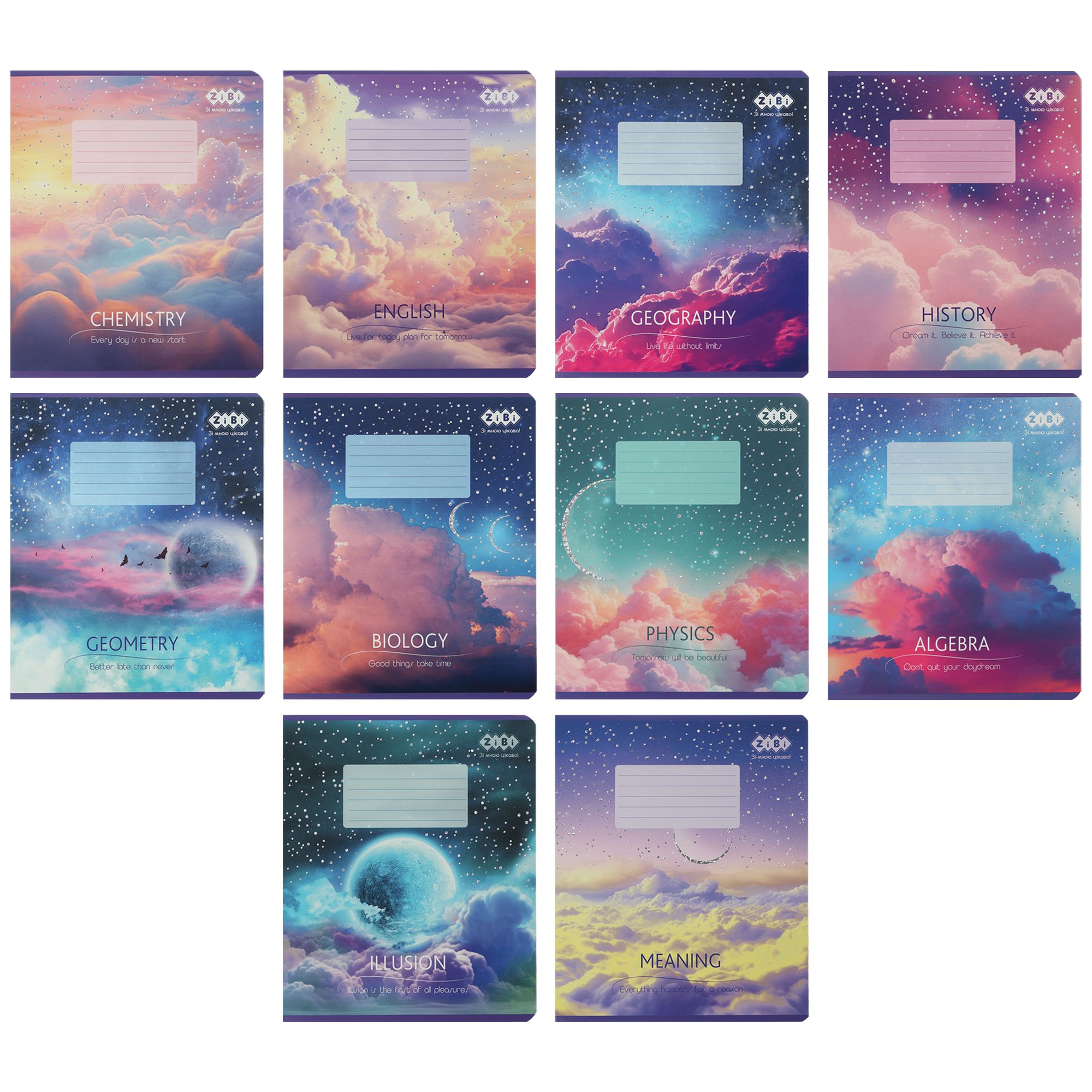 Набор тетрадей ученических школьных серии "CLOUDS" от ZiBi с популярным современным дизайном обложки и блоком полезной справочной информации по различным школьным предметам отлично подходит для выполнения классных и домашних работ.