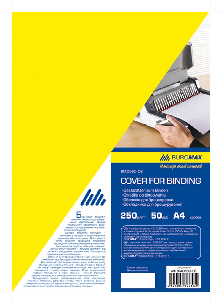 Обложки для переплета BUROMAX формата А4. Обложка картонная с фактурой глянец, желтая, плотность 250г/м2, используется для нижней обложки брошюры. Упаковка 20шт.