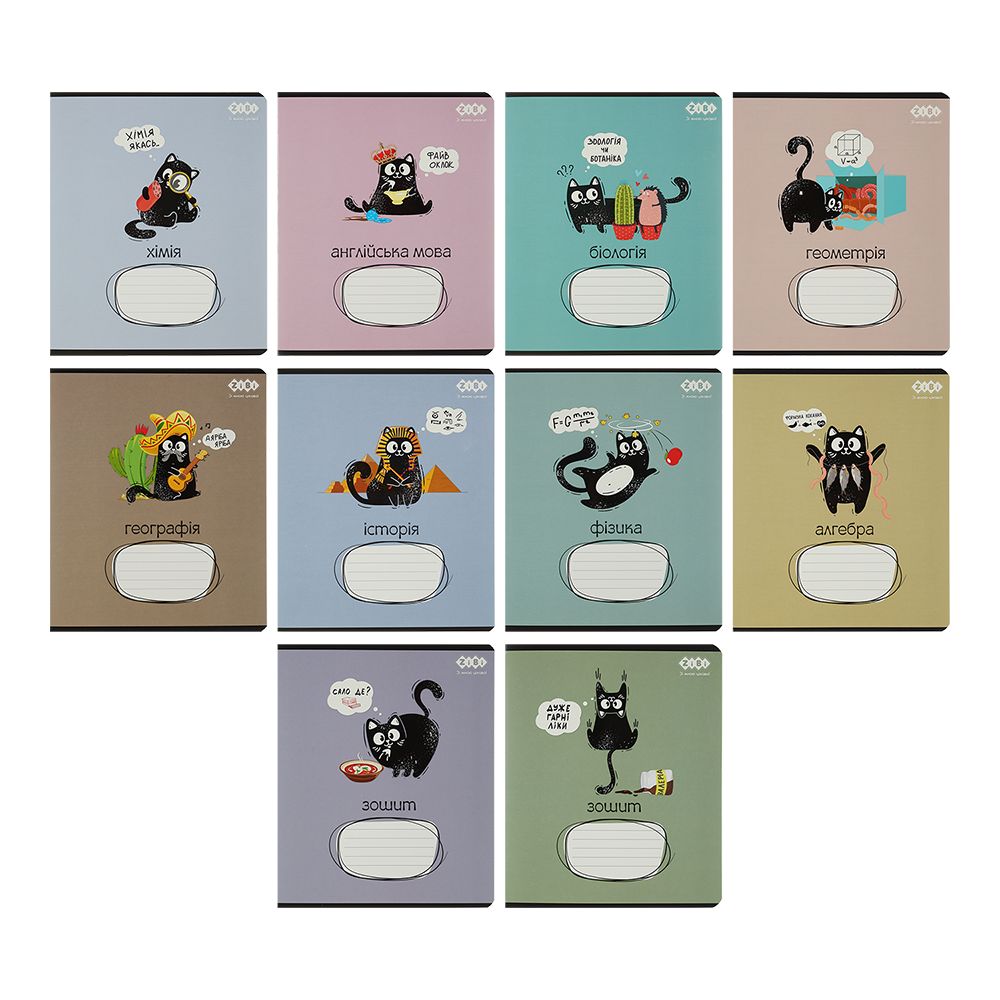Набір містить 10 зошитів з 8 предметів: алгебра – 1 шт, геометрія – 1 шт, фізика – 1 шт, хімія – 1 шт, біологія – 1 шт, географія – 1 шт, історія України – 1 шт, англійська мова – 1 шт, зошит загальний (без довідкової інформації) - 2 шт.